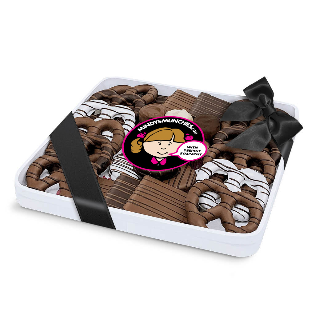 Mindy’s Munchies Sympathy Platter contains an assortment of our famous freshly-dipped, chocolate-covered pretzels, crunchy grahams and chocolate-covered OREO®s, fluffy marshmallows and more!