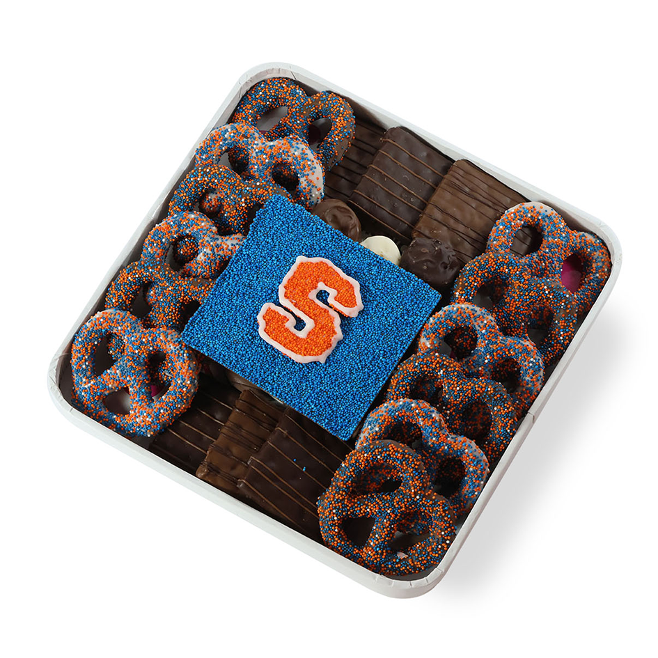 Each platter is handcrafted with rich, gourmet chocolate covered treats and decorated with school-colored nonpareil sprinkles and/or drizzle. The centerpiece? A bold, edible version of your college’s logo made entirely from chocolate—guaranteed to impress and delight.