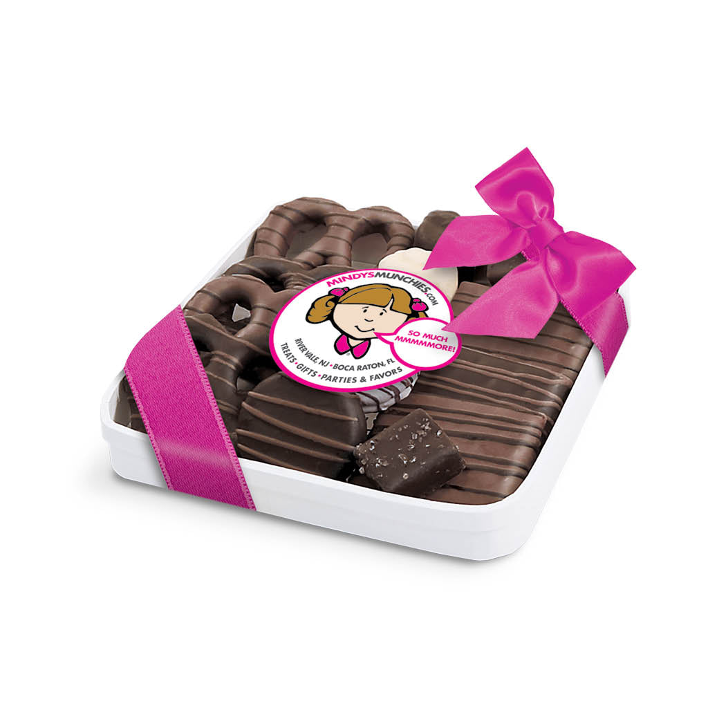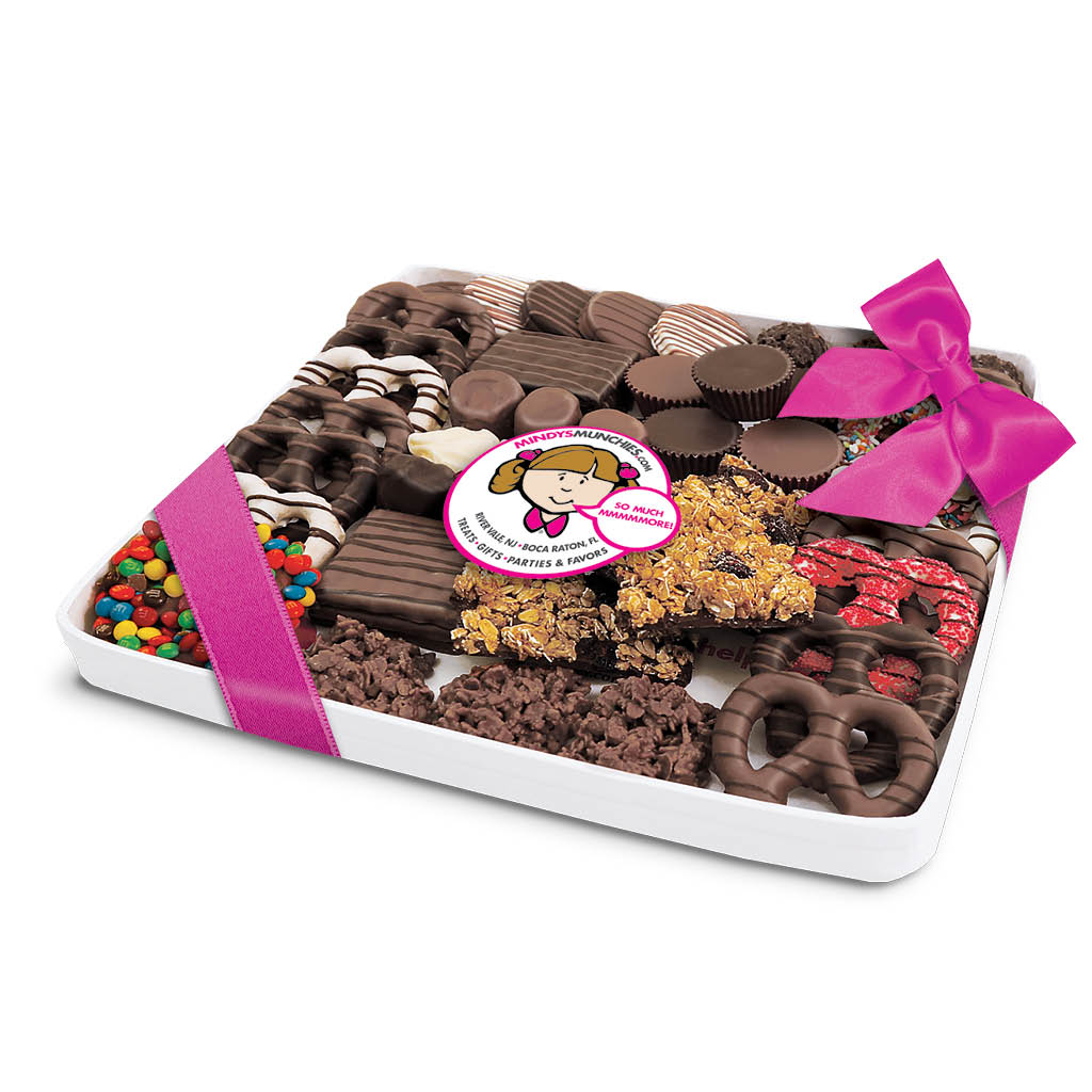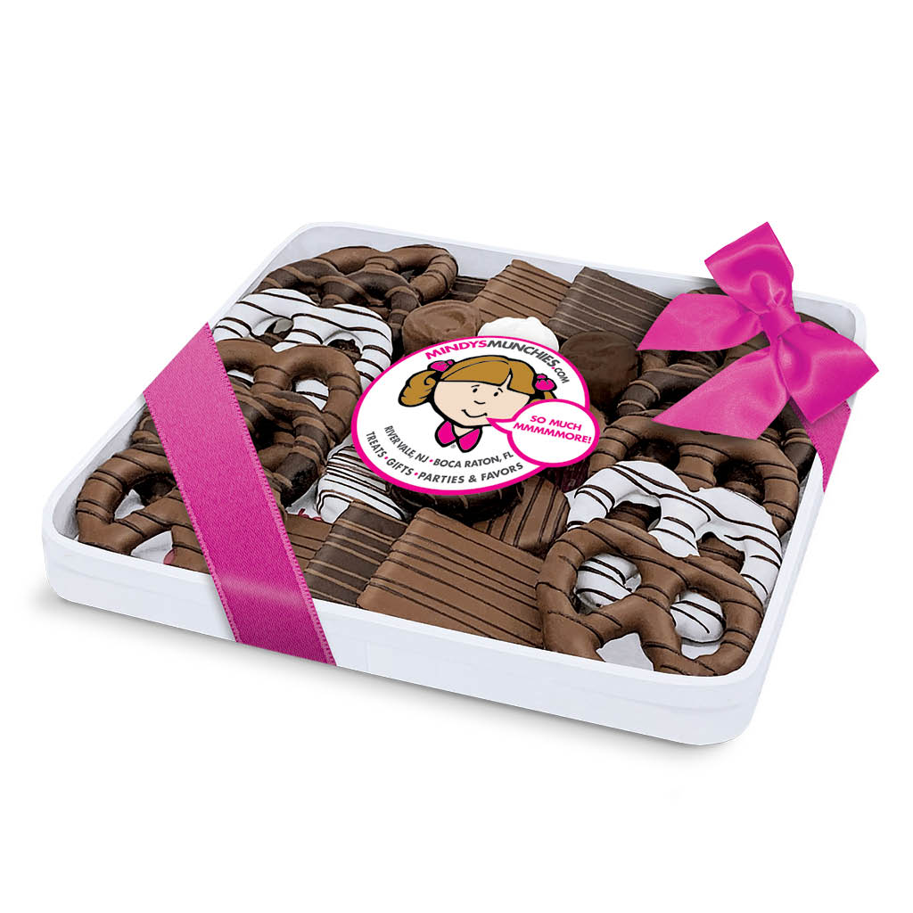 Mindy’s Munchies Platters contains an assortment of our famous freshly-dipped, chocolate-covered pretzels, crunchy grahams and chocolate-covered OREO®s, fluffy marshmallows and more!
