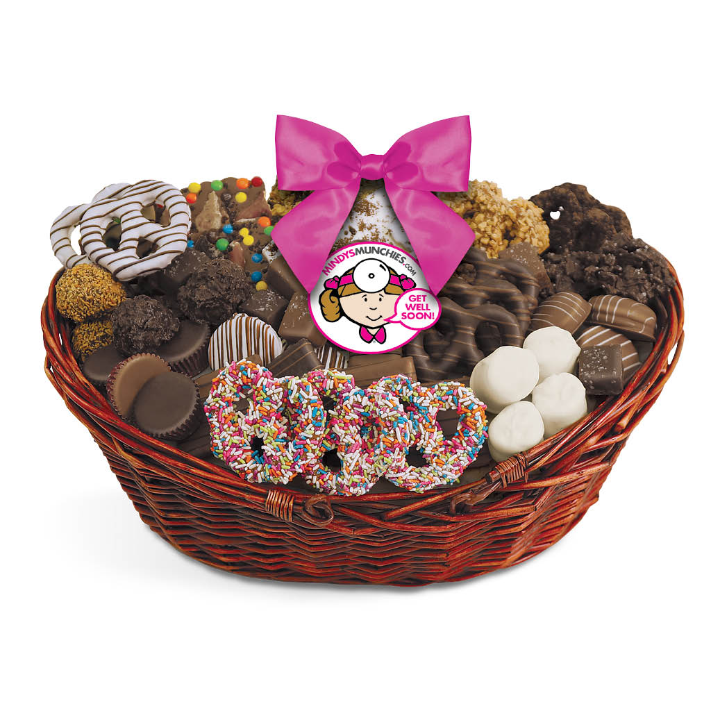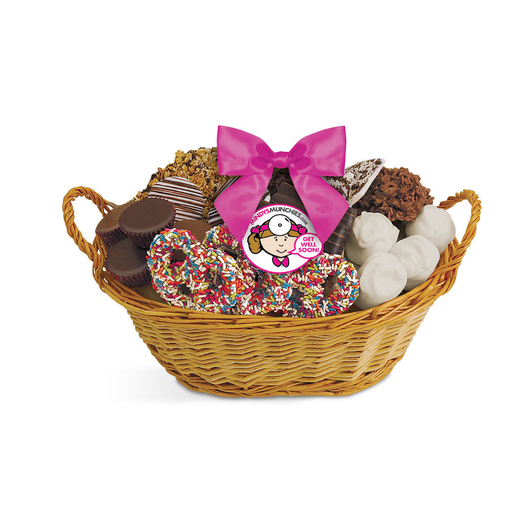 Mindy’s Munchies Get Well Baskets contain an assortment of our famous freshly-dipped, chocolate-covered pretzels, crunchy grahams, fluffy marshmallows, chocolate-covered OREO®s, peanut butter cups, granola bark, coconut clusters, Rice Krispie clusters and more!