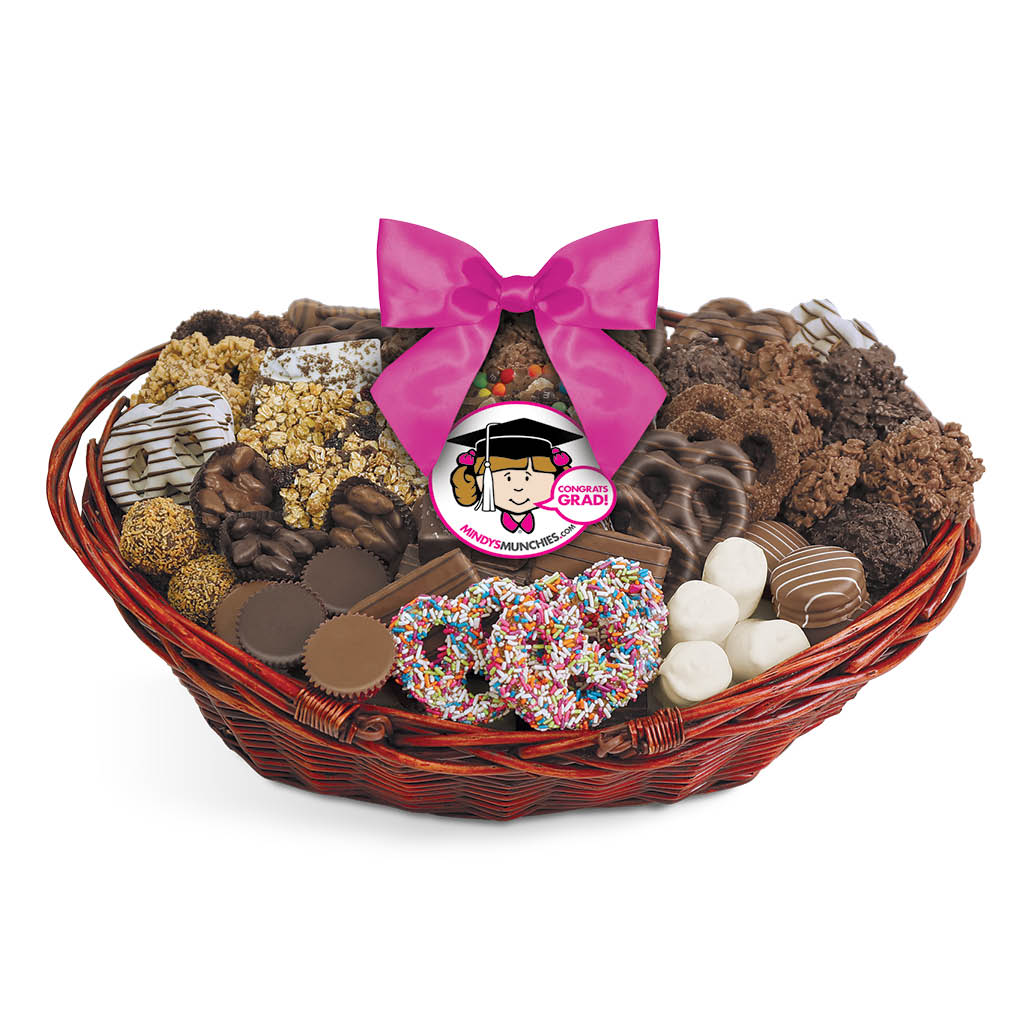 Mindy’s Munchies Graduation Baskets contain an assortment of our famous freshly-dipped, chocolate-covered pretzels, crunchy grahams, fluffy marshmallows, chocolate-covered OREO®s, peanut butter cups, granola bark, coconut clusters, Rice Krispie clusters and more!