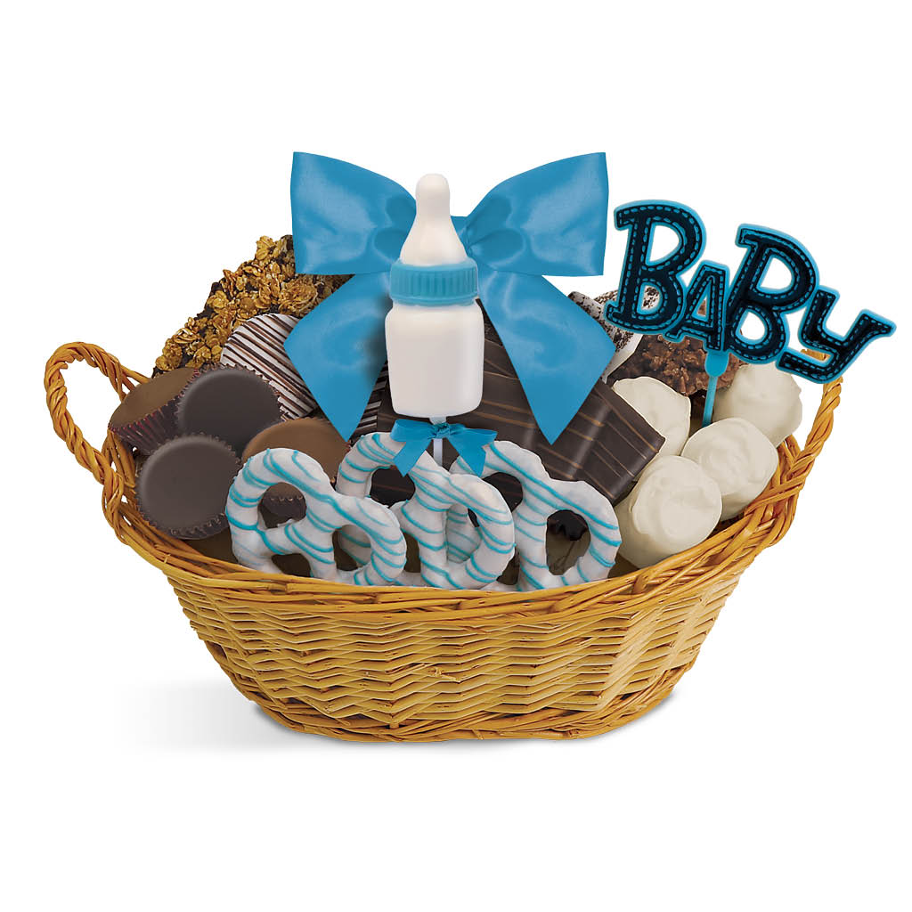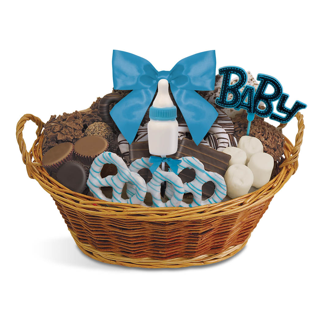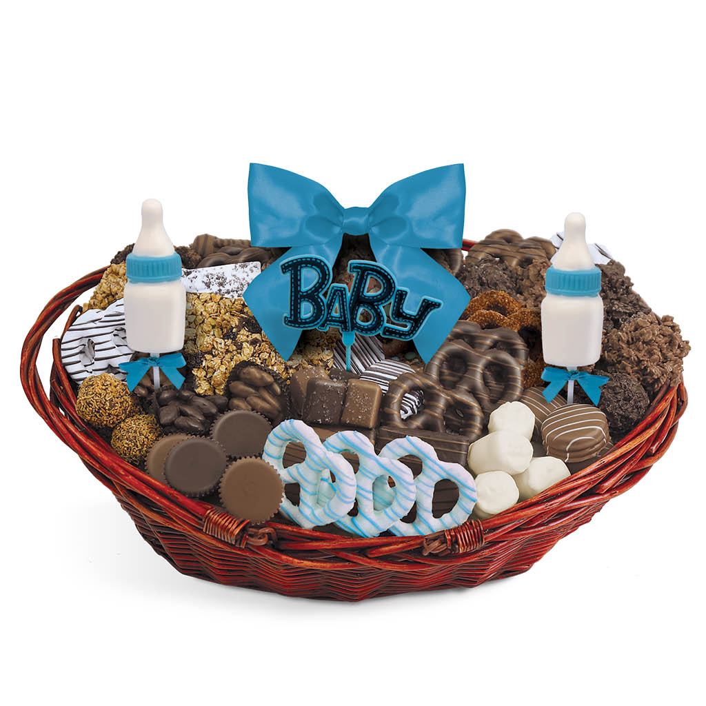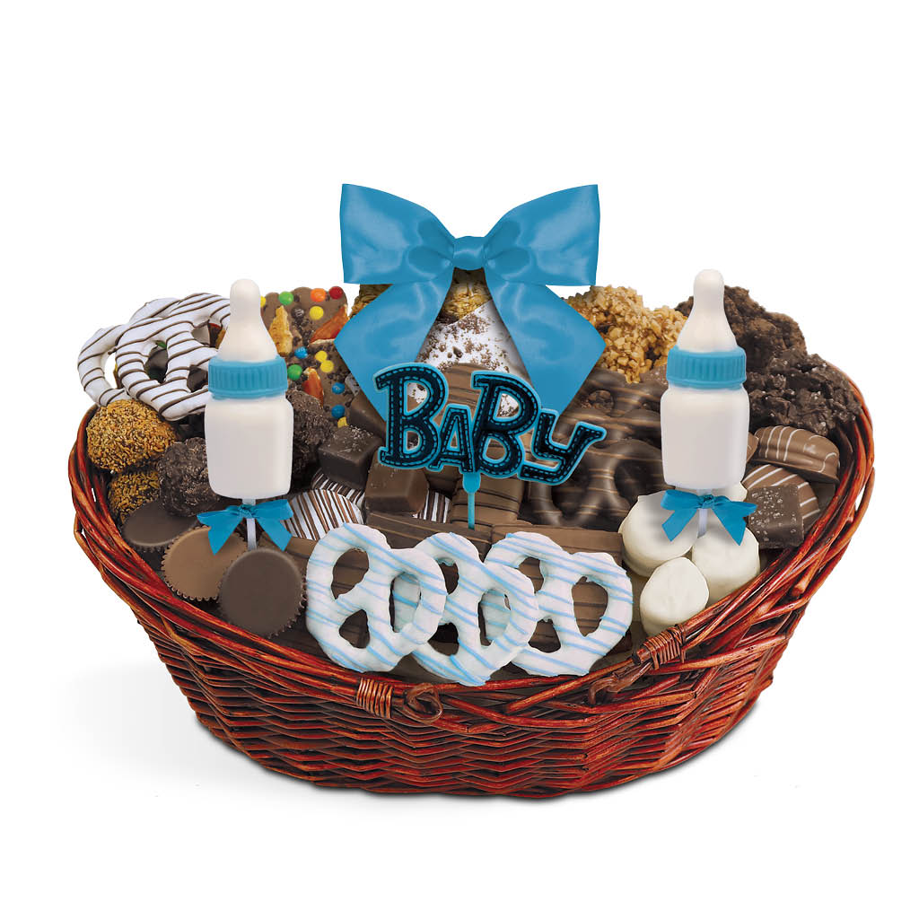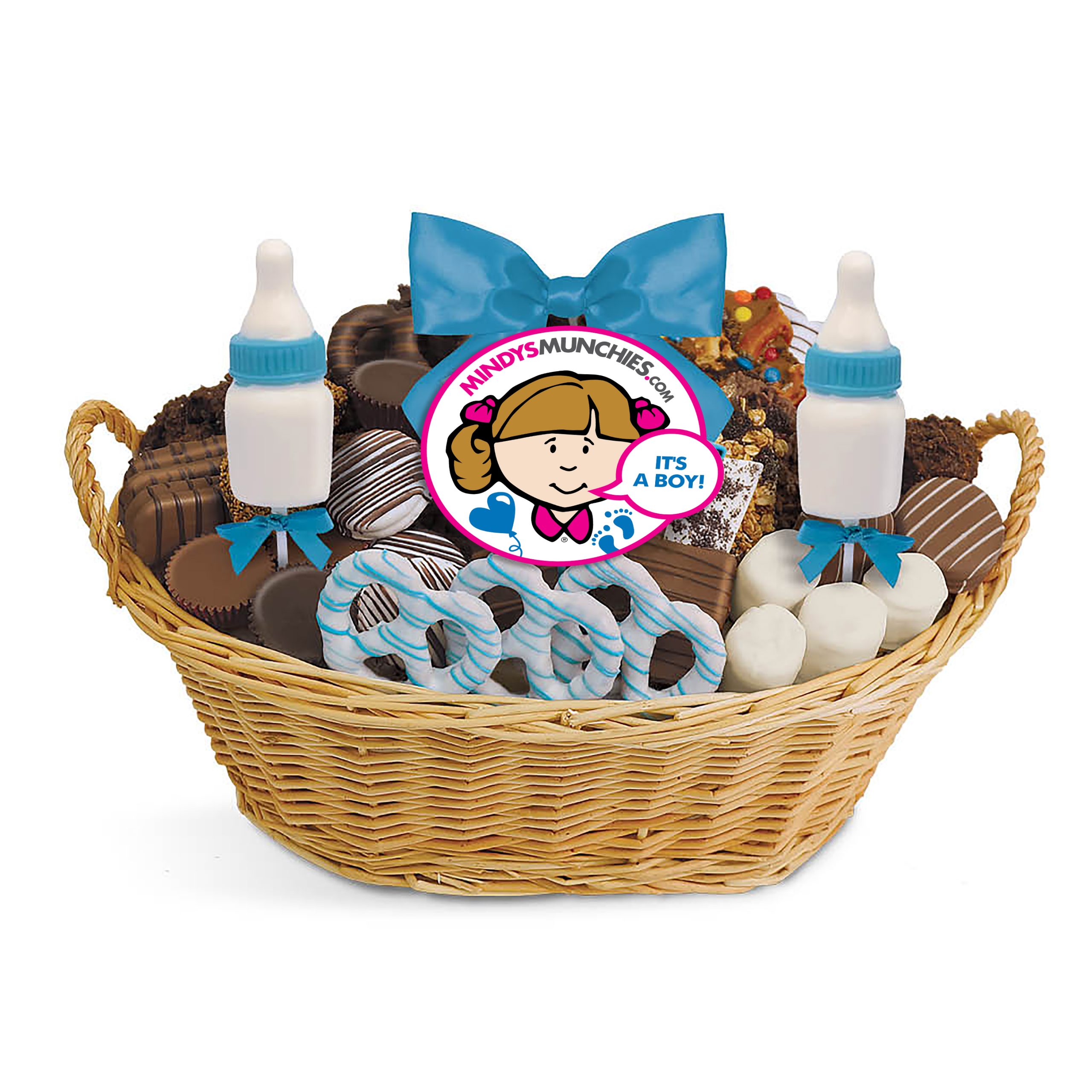 Mindy’s Munchies Baby Boy Baskets contain an assortment of our famous freshly dipped, chocolate-covered pretzels, crunchy grahams, fluffy marshmallows, chocolate-covered OREO®s, peanut butter cups, granola bark, coconut clusters, Rice Krispie clusters and more!