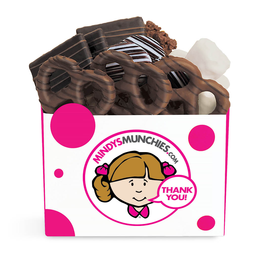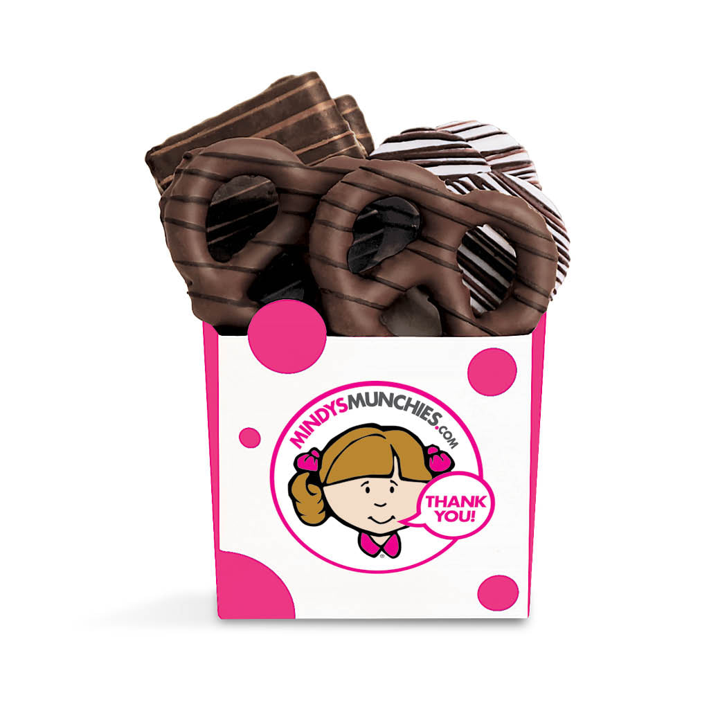 Mindy’s Munchies Thank You Gift Boxes contain an assortment of freshly dipped, chocolate-covered pretzels, crunchy grahams, and chocolate-covered OREO®s!